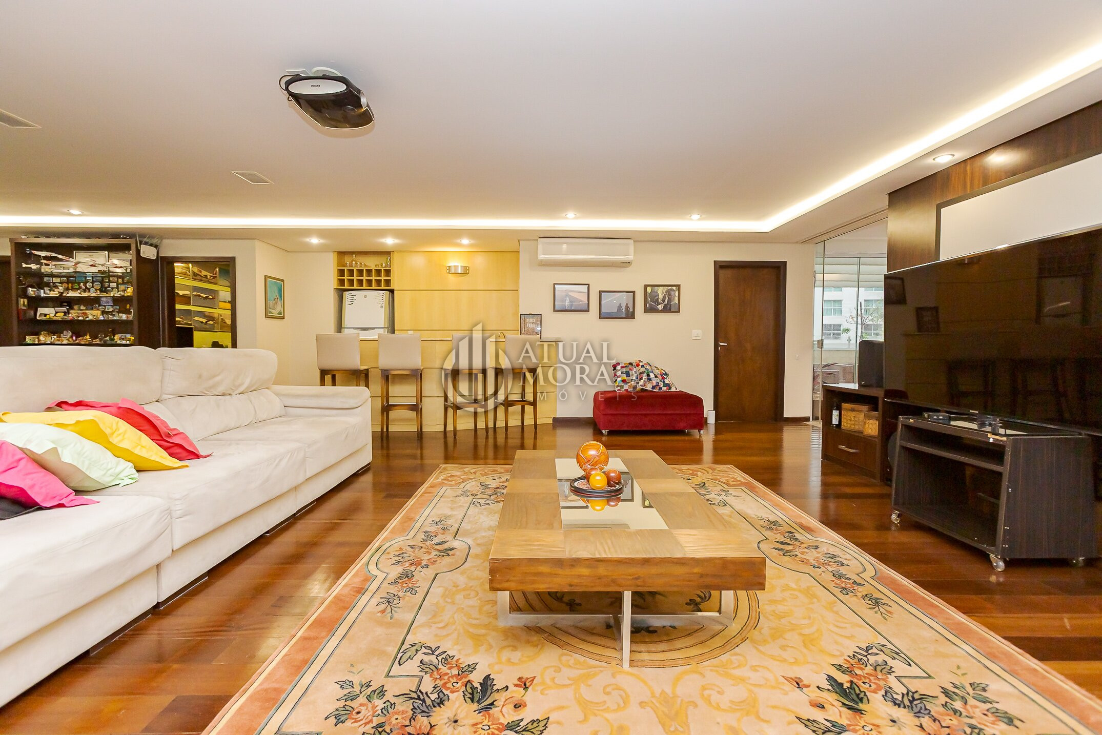 - Sala de TV com projetor, telão e sofá amplo